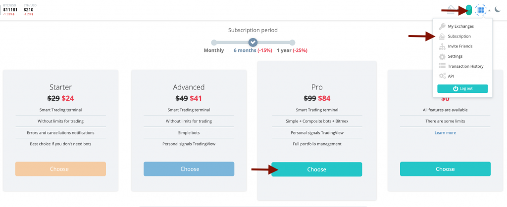 The 3Commas service is available here: link. Use the referral link or code tc12655 to get a 10% discount. After registration, you will get free full access to all 3Commas features for 3 days. If your deposit is less than $750, the service, with all its features, will remain free for you after the trial period ends. If you have more than $750 on your balance, you will need to choose one of the subscriptions. For the KISS Signals we will be using a composite bot.