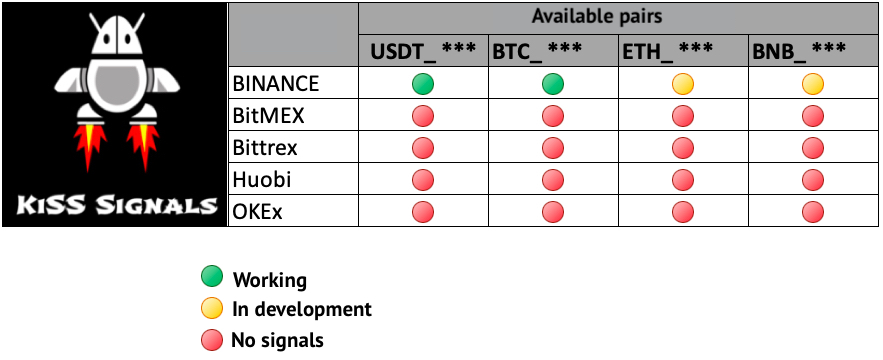 KISS Signals can be used on BINANCE and is only available for USDT and BTC trading pairs. Support for ETH and BNB pairs is currently in development: