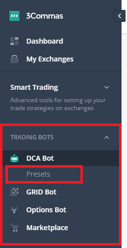 Presets are parameters for DCA bots configured by other traders. Every 3Commas platform user can use presets for bots to automatically trade on desired exchanges.