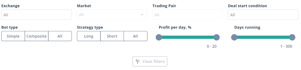 Specify the appropriate parameters to search for bots on the “Bot presets” page. To do so, choose your preferred exchange, traded asset, trading pairs, conditions to start deals, types of bots and strategies, and select the necessary timeframe and profit ratio.
