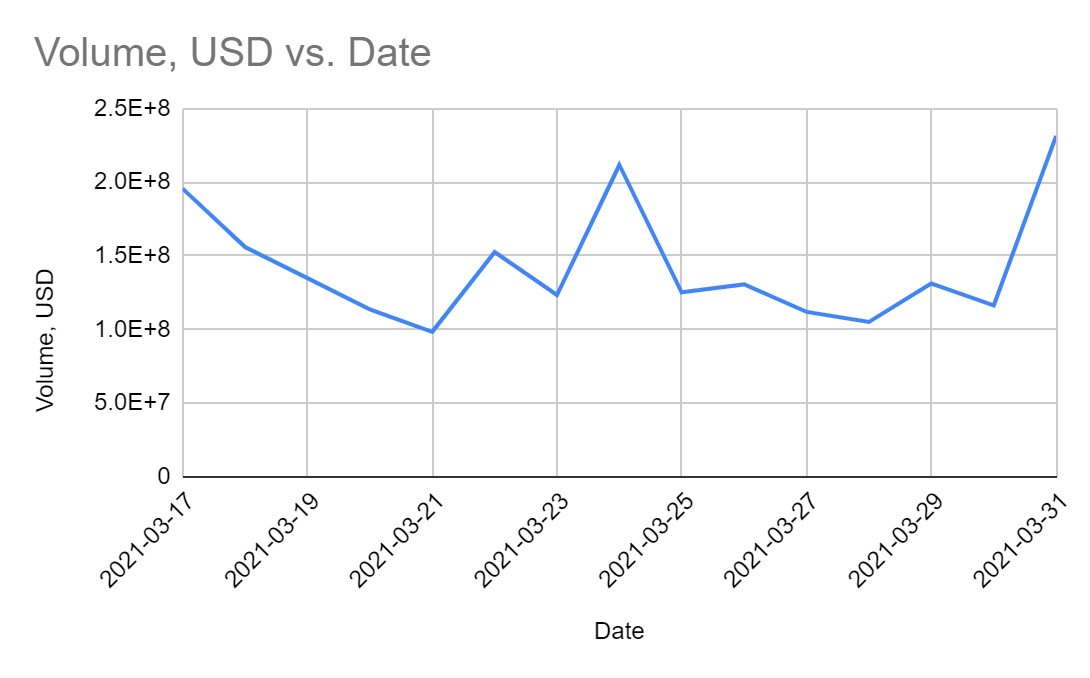 Unfortunately, we did not notice any correlation but the trading volume increases during the strong market movements. Perhaps, it is associated with the achievement of some extreme indicators that forced the bots to open trades.