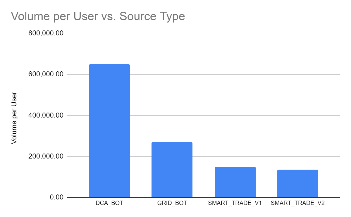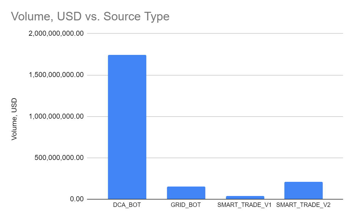 Obviously most of our users prefer to automate trading with the help of our bots. And if the number of unique users of smart trades can still somehow compete with the number of bot users, then the trading volume of DCA bots is significantly higher than that of other instruments.