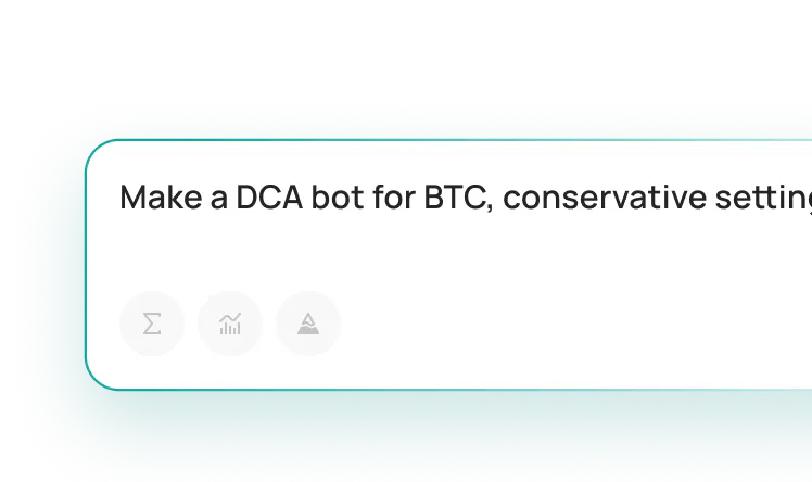 Diga algo como: "Faça um bot DCA para BTC, configurações conservadoras, orçamento mensal $5000." A IA faz perguntas complementares se necessário, depois constrói toda a configuração passo a passo, em sua linguagem.