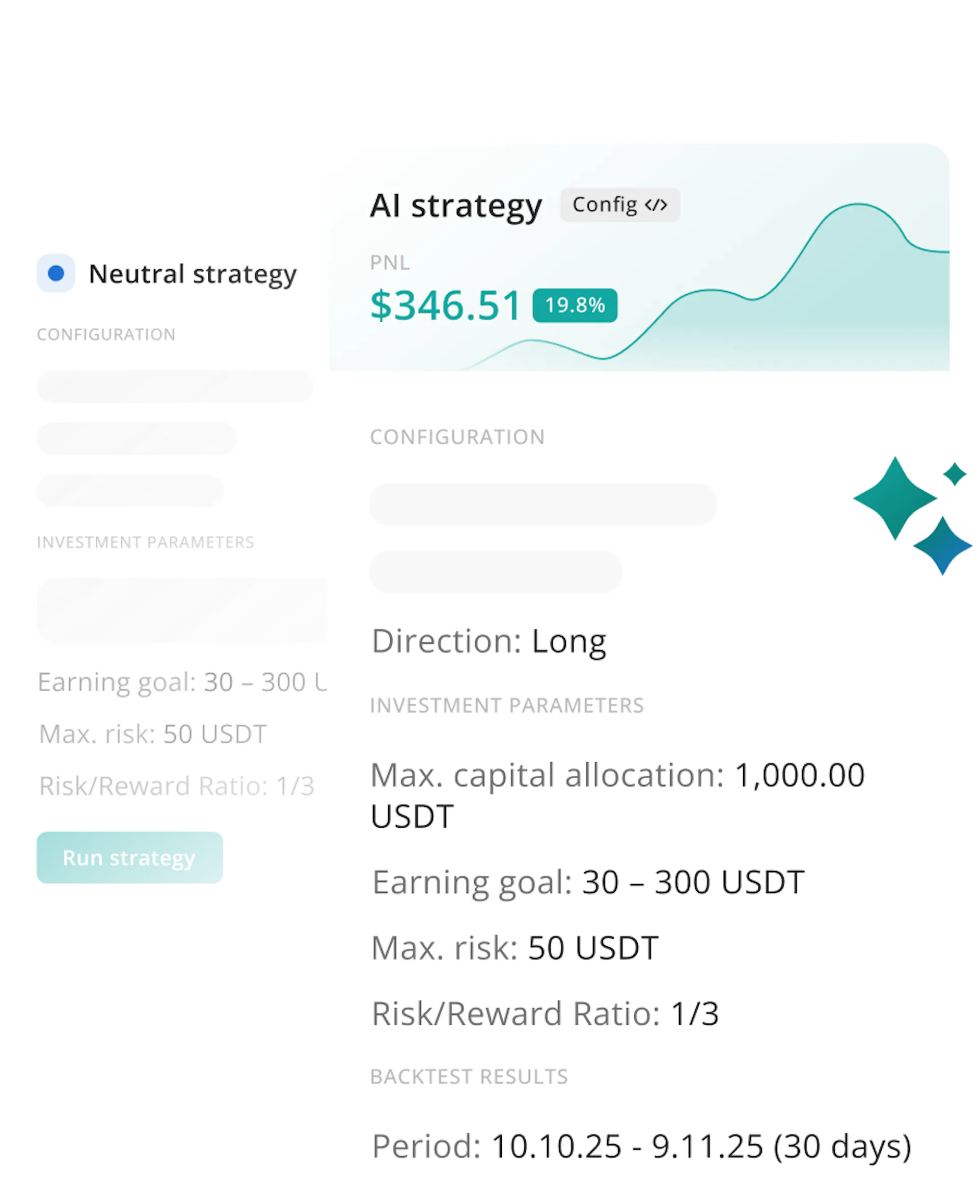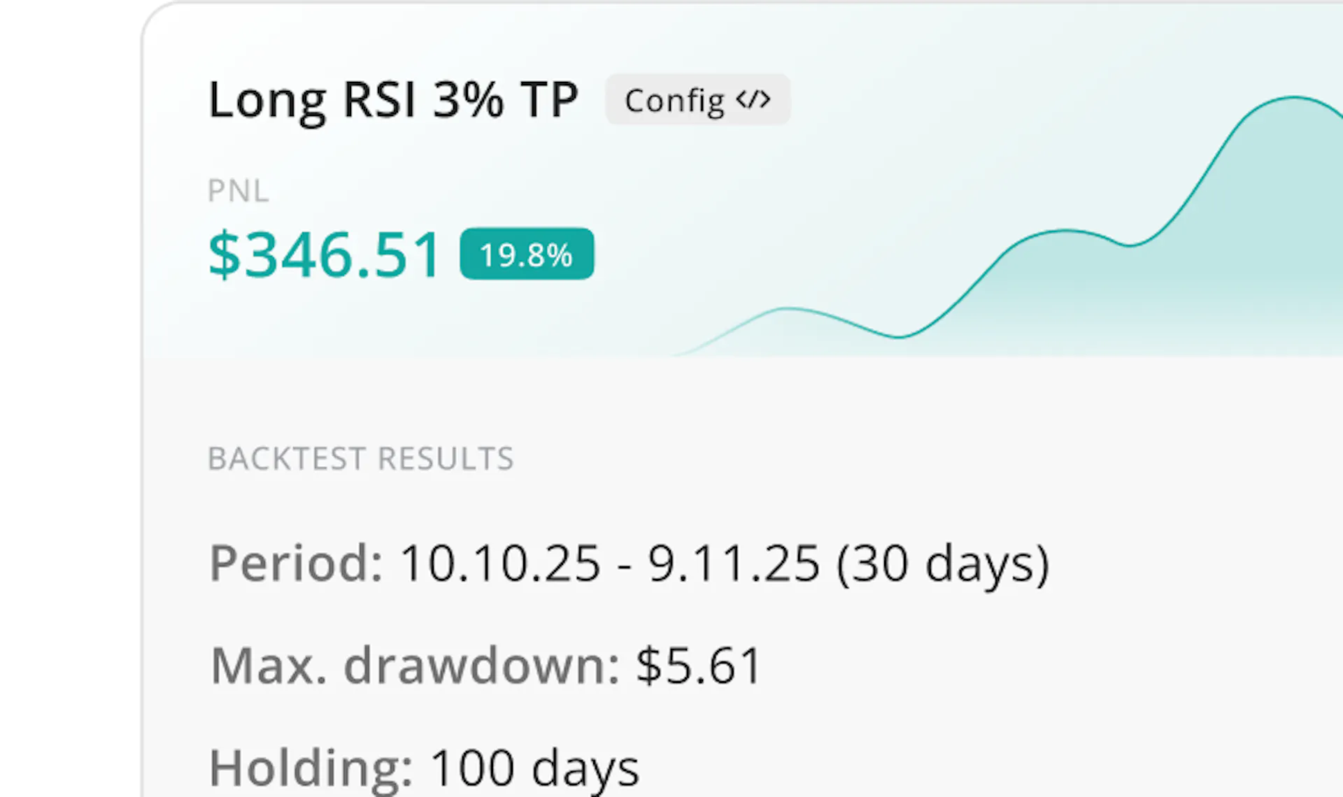 Teste sua estratégia de trading com dados reais de mercado — rápido e fácil. Deixe nossa IA sugerir configurações mais inteligentes antes de arriscar fundos reais.