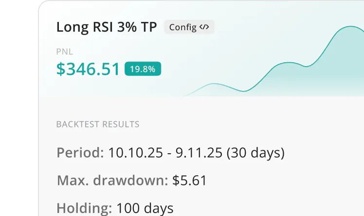 Descreva sua estratégia em linguagem simples e a IA configura, testa e lança o bot para você.