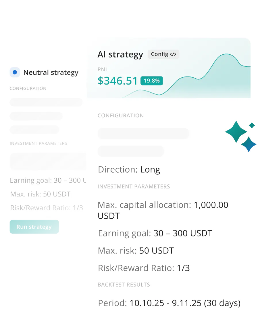 Digite o que você quer negociar, em qual exchange, e com que nível de risco. A IA preenche as configurações, pergunta apenas o que está faltando, e mostra uma estratégia pronta para executar. Sem formulários, sem configurações manuais.