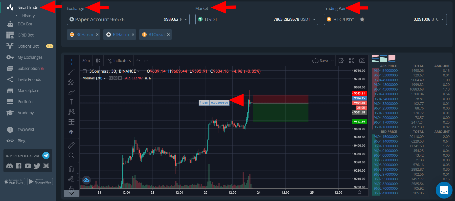 В разделе SmartTrade бокового меню можно проанализировать график нужного актива и произвести все настройки. Для начала необходимо выбрать биржу для торговли. Вы всегда можете сначала опробовать функционал на тестовом счете: