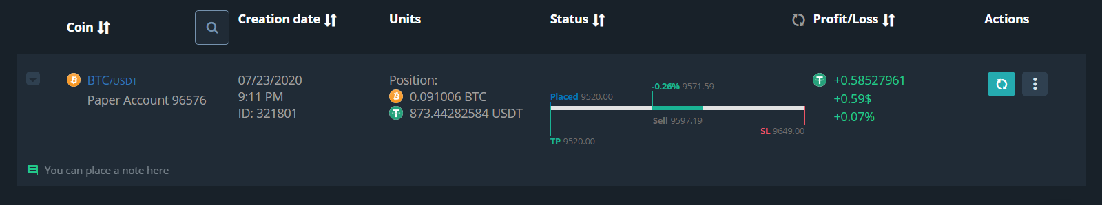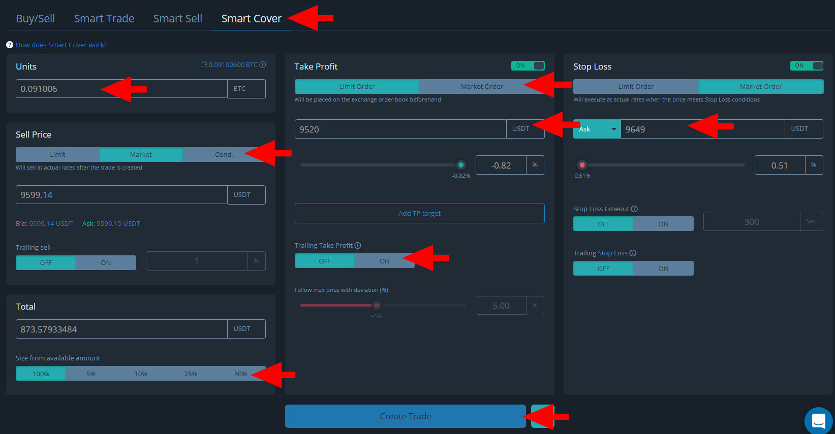 К примеру, мы увидели, что цена Биткоина находится в растущем тренде и достигла точки локальной коррекции, и определили что цена BTC скорректируется до уровня $9520. Во вкладке Откупатор (Smart Cover), согласно нашему риск-менеджменту, выставляем размер позиции и цену по которой мы хотим продать и откупить ВТС (Take Profit), а так же цену по которой актив будет куплен, если цена все же уйдет выше (Stop Loss). После создания и подтверждения сделки, наш торговый план будет исполняться в автоматическом режиме: