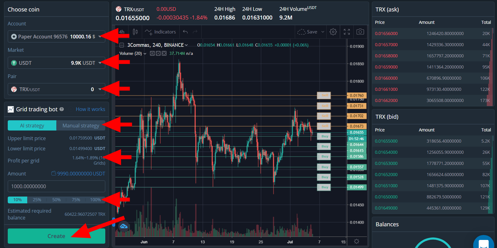 - AI стратегия — где необходимо выбрать биржевой счет, рынок и пару, а также долю депозита которую вы планируете использовать для данной стратегии. В остальном бот сам мастерски раскинет сеть ордеров в текущем диапазоне консолидации по заданному алгоритму.