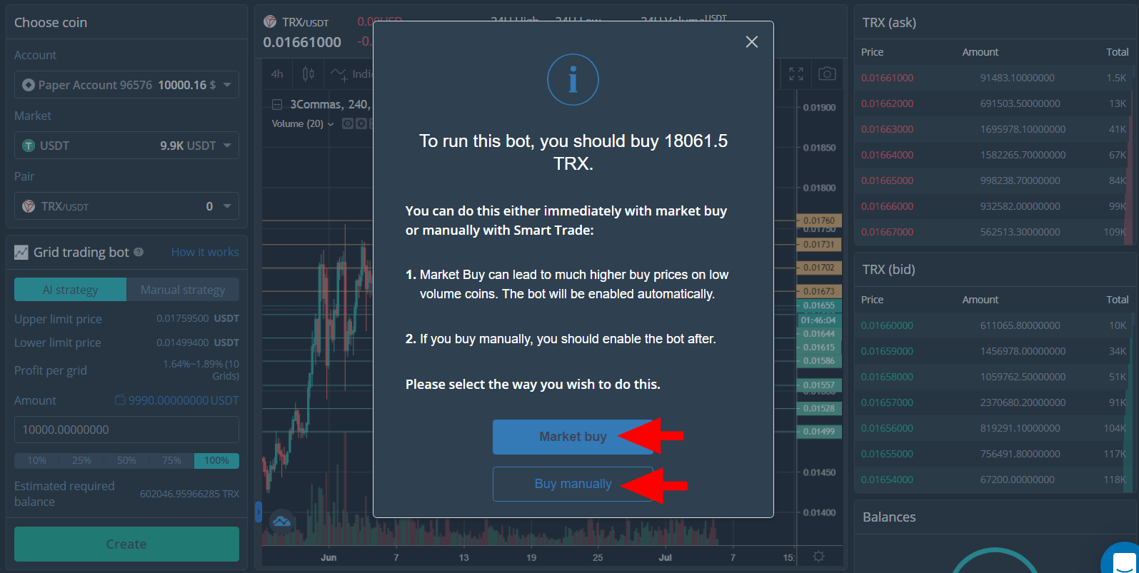 После выбора стратегии и настроек, при условии, что потенциальный профит вас устраивает, создайте бота и если на балансе нет какого-либо актива из пары, бот предложит купить необходимые удобным для вас способом:
