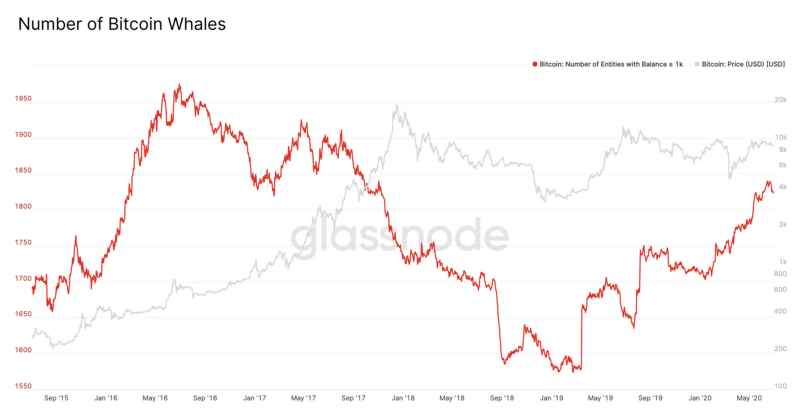 По данным, основанным на кластерной эвристике Glassnode, после сокращения с 2016 года “популяция” Биткоин-китов снова растёт, с января 2020 года рост практически непрерывен. Количество китов возросло до 1800 и, возможно, находится на пути к преодолению предыдущих максимумов.