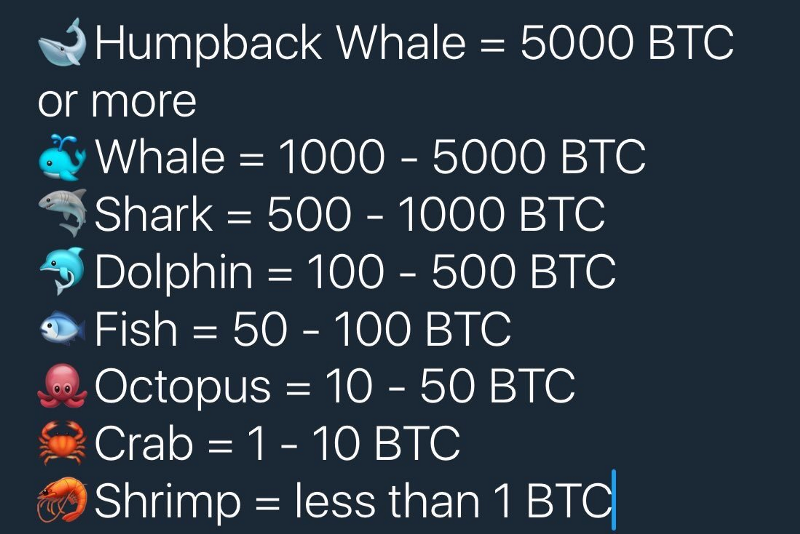 Биткоин-китами принято считать участников рынка с балансами не менее 1000 BTC или эквивалентом не менее 10 миллионов долларов. При этом на просторах сети интернет можно встретить целую “морскую” классификацию держателей Биткоина от “креветок” с балансом менее одного Биткоина до “крупных китов”, оперирующих 5000 BTC и более.