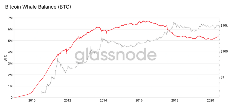После снижения с 2016 года количество Биткоин-китов впервые начало увеличиваться в начале 2020 года. Аналогичным образом обстоит и ситуация с балансом BTC, удерживаемом этими крупными игроками. Несмотря на это, общий баланс в долларовом эквиваленте, удерживаемый китами, всё ещё ниже своего пика, который был достигнут в разгар бычьего рынка в конце 2017 года. Причина, по которой явный рост численности новых китов не приводит к значительному увеличению общего баланса активов всех китов в долларовом эквиваленте кроется в том, что крупные игроки не приобретают новые BTC, а в большинстве своём выводят уже принадлежащие им монеты с бирж.