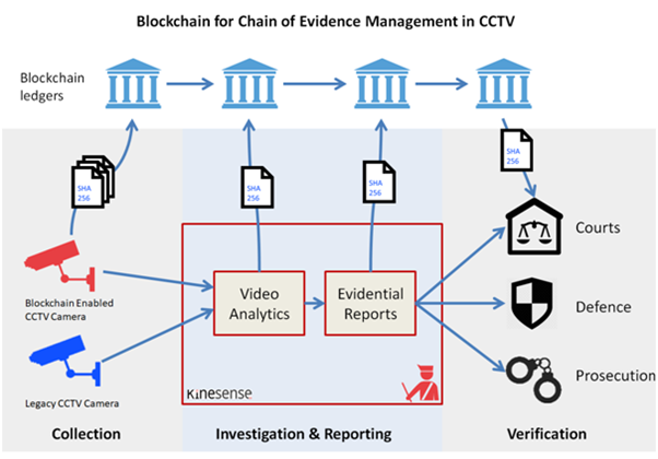 Очередным примером использования распределенного реестра является система управления (сбора, хранения) цифровыми и вещественными доказательствами принцип которых заключается в следующем:
