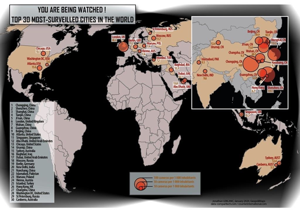 Индустрия видеонаблюдения это не только обеспечение охраны объектов, но также система слежения и контроля над различными процессами. Общее число установленных камер по всему миру назвать не представляется возможным. Лидером же по их количеству, несомненно, является Китай. В первую десятку вошло 8 крупнейших китайских городов. А в городе Чунцин на каждые 1000 человек приходится 168 камер.