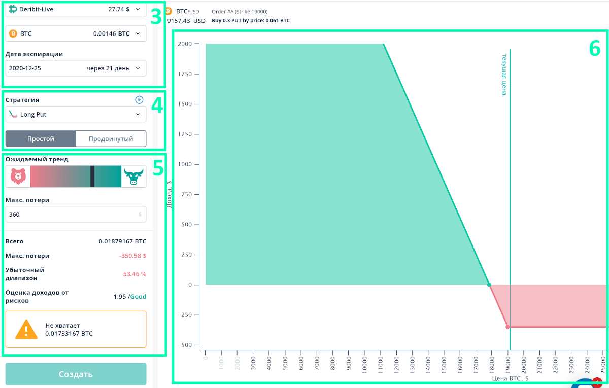 Стратегия (4) — это тип настраиваемой сделки. Для данного примера мы используем стратегию Long Put, которая позволяет определить точное количество средств, которыми вы рискуете в случае роста цены биткоина, но при этом обеспечивает неограниченный потенциал прибыли в случае ее падения. Мы также используем простой пользовательский интерфейс, так как мы хотим позволить Опцион Боту вычислить базовые переменные для этой сделки. Вы можете наводить мышь на точки на графике или прикасаться к ним (6) для получения информации о прибыли или убытках по вашей сделке на определенных ценовых уровнях.