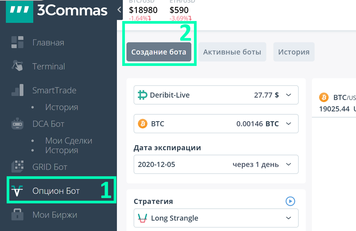 Перейдите в главное меню и выберите вкладку Опцион Бот (1), а затем нажмите кнопку Создать бота (2):