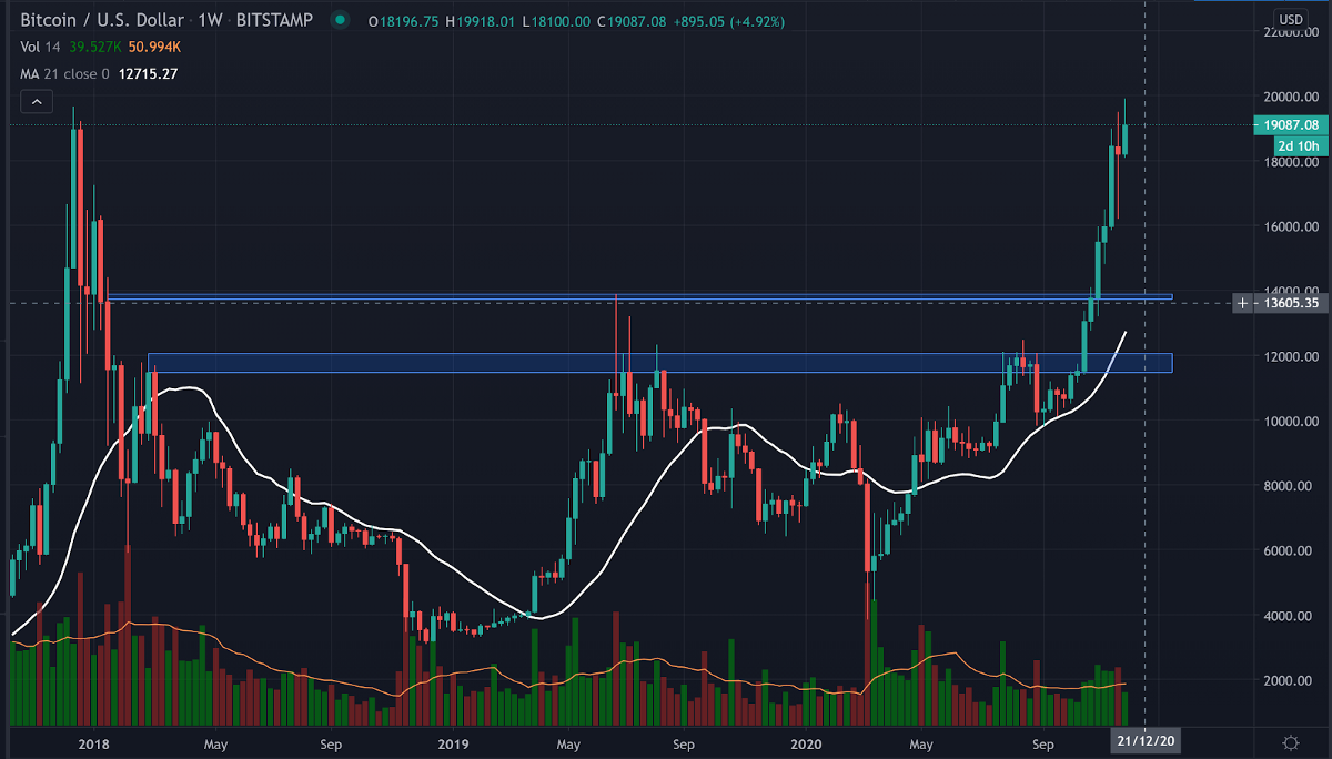 - Также 21W MA (скользящая средняя — белая линия), область, к которой цена склонна отступать во время бычьих циклов, и ее ожидаемое значение через 2 недели, опираясь на текущую траекторию (около $13 600).