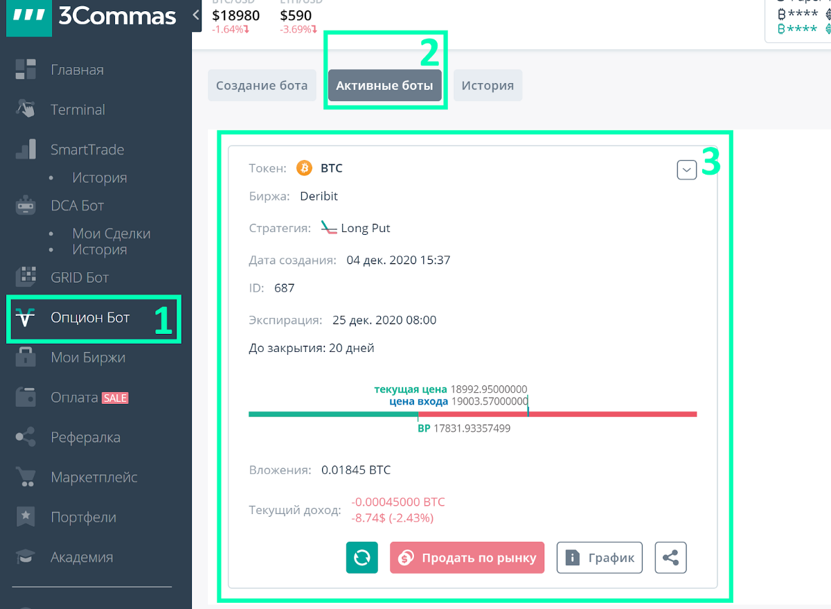 Здесь будут отображены все запущенные вами опционные боты, и вы сможете просмотреть текущее состояние вашей позиции (3), от текущей прибыли или потерь, времени, оставшегося до истечения срока действия активного контракта, до краткого описания выбранных вами настроек торговли.