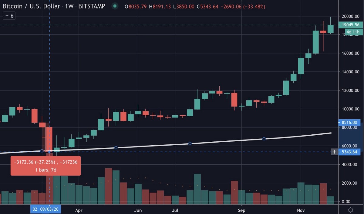 Однако, в глубине души вы будете думать, что «графики не могут расти бесконечно», и вы знаете, что в какой-то момент тренд развернется или произойдет массивная коррекции; например, значительное падение на -37% (не учитывая фитилей), которое произошло в марте 2020 года, может повториться. На самом деле, биткоин на протяжении всей своей истории испытывал 30-40% коррекции впоследствии предыдущих бычьих циклов.