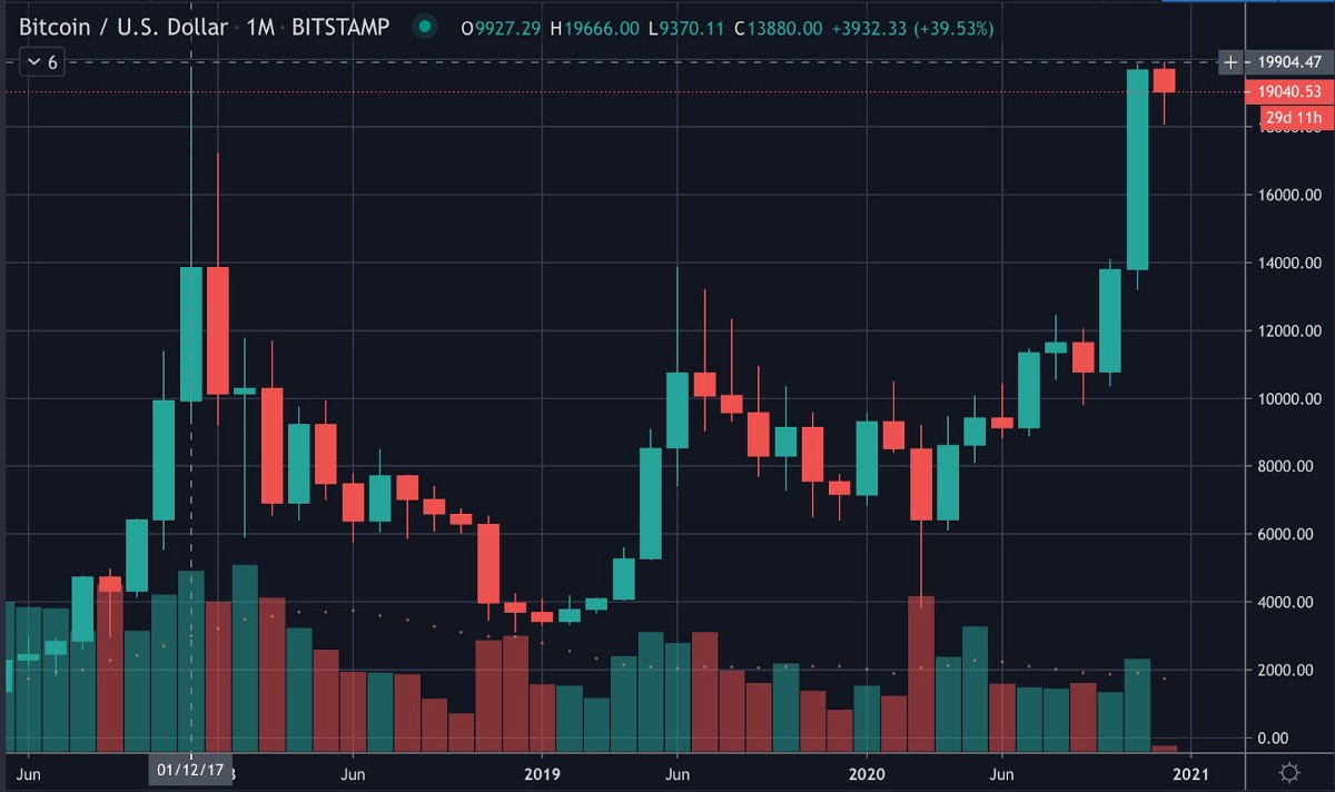 - Текущая цена на графике биткоина в настоящее время составляет около $19 000 и коррекция на -30% от этого ценового уровня будет означать падение примерно до $13 300;