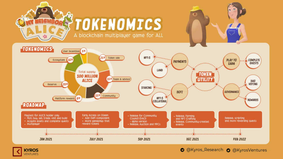 Собственный утилитарный токен ALICE используется в качестве внутриигровой валюты, токена управления через DAO, а также в качестве поощрений и наград за выполнение заданий. Особенностями игры являются разработка сюжетной линии с множеством квестов, а также возможность совместных действий пользователей для достижения общих целей. Стоит также отметить, что в январе 2021 года прошло тестирование игры на площадке Steam в котором участвовали ранние инвесторы, а ее запуск для всех желающих намечен на весну 2022 года.