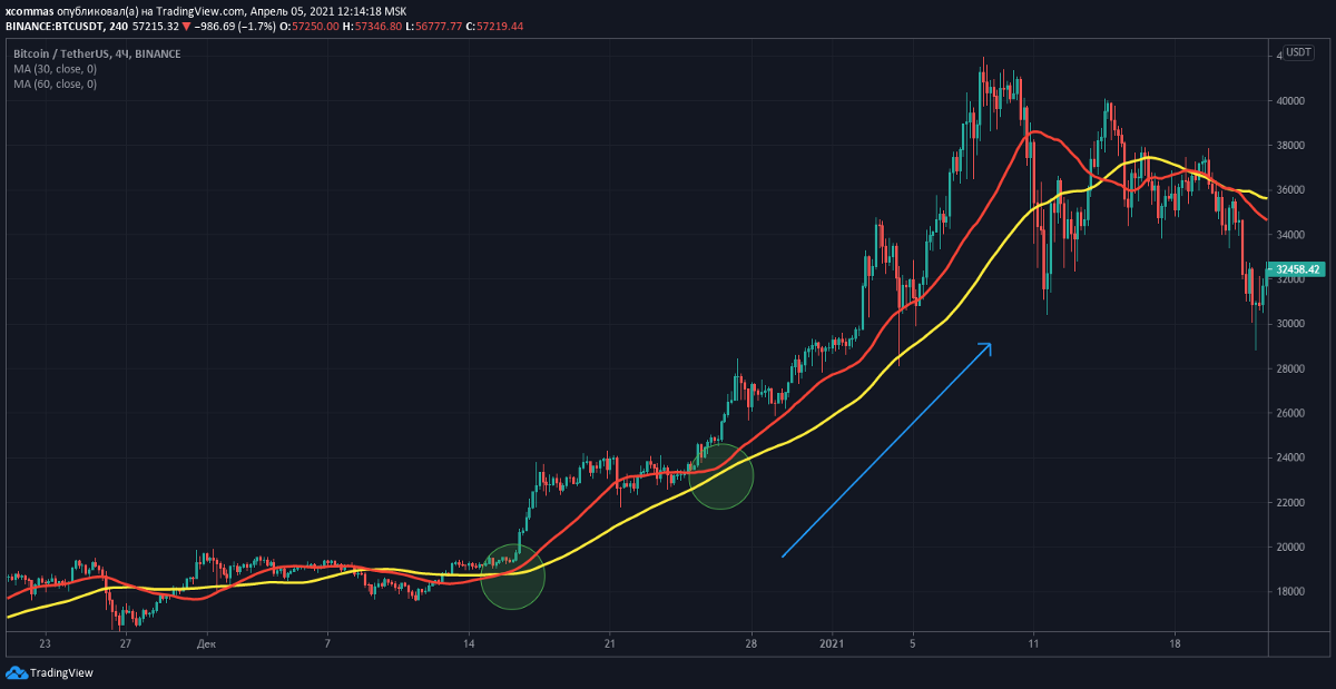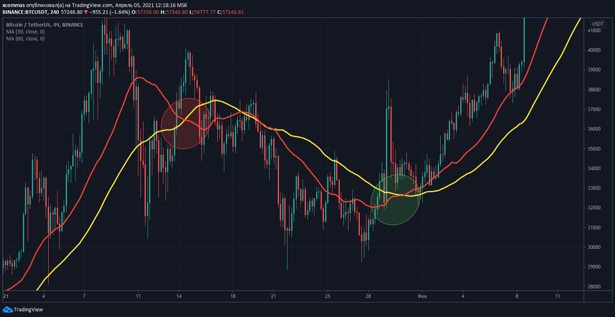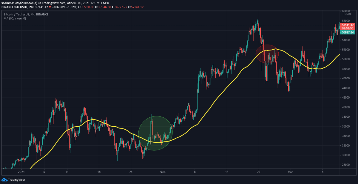 Итак, для начала рассмотрим определение тренда с помощью SMA. Если цена находится выше средней скользящей, актив находится в аптренде, причем часто SMA (как и EMA) могут служить динамической поддержкой. Пример: 4-часовой график Биткоина, пробой и ретест 60 SMA в зеленой зоне, падение ниже в красной зоне.