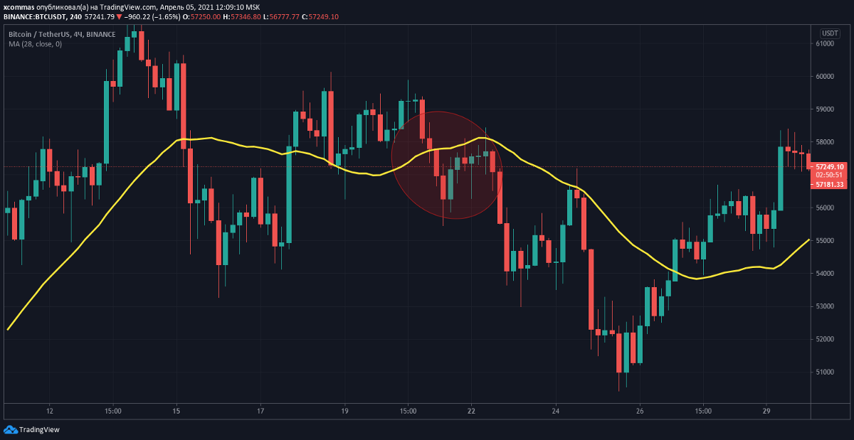 Аналогичный пример: падение ниже 28 SMA, актив в локальном нисходящем тренде.