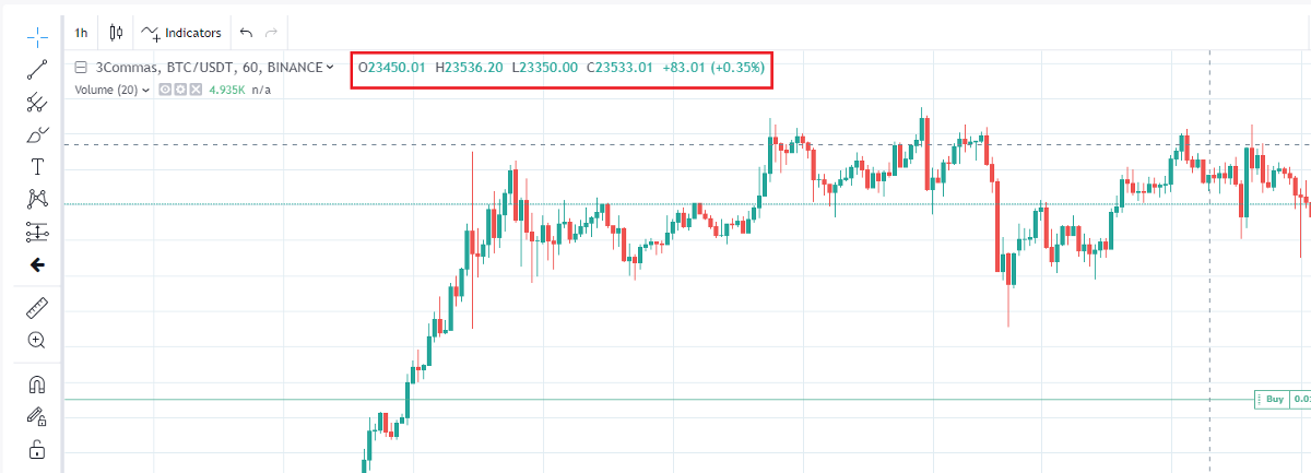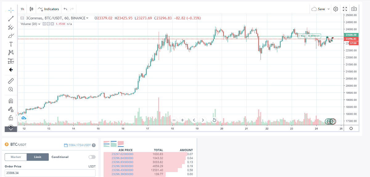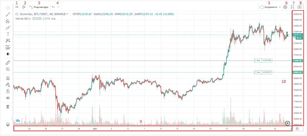 Торговый терминал 3commas отображает график движения выбранной торговой пары из платформы Tradingview. Сама по себе она имеет огромное количество опций для настройки графика, сохранения, редактирования и рисования. Мы рассмотрим самые важные из них по порядку. Растянем график, для более удобной работы с ним.