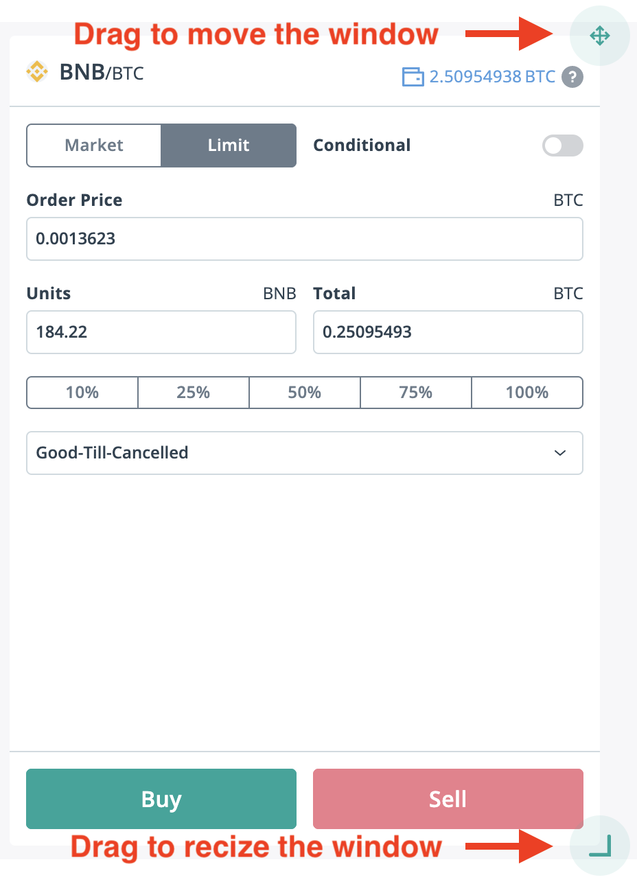 Ниже мы подробнее рассмотрим каждый из этих пунктов. А пока перейдем к настройке интерфейса. Торговый терминал 3commas имеет заданное по умолчанию размещение вышеупомянутых элементов интерфейса, однако вы можете подогнать их под себя. При наведении курсора на меню размещения ордеров, ордербука, графика или истории сделок в верхнем и нижнем углу отображаются кнопки для перемещения или растягивания окна.