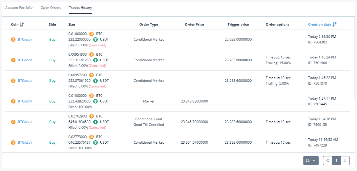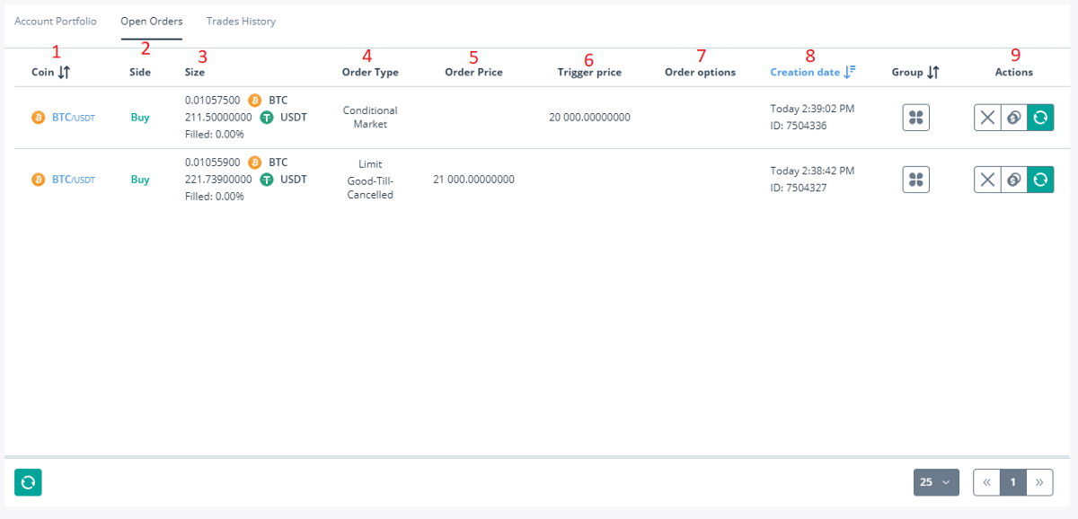 Список ордеров можно обновить нажав зеленую кнопку в нижней части меню. Справа есть страницы списка ордеров с настройкой вывода определенного количества ордеров на одной странице (в данном случае на каждой странице будут отображены 25 или меньше ордеров).