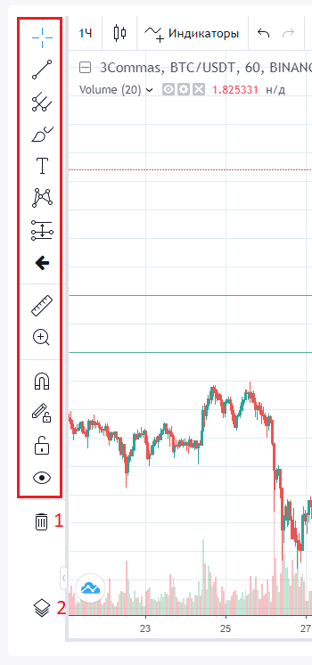В боковом меню слева вы сможете найти инструменты для рисования на графике, линейки для цены/временных промежутков, построения фигур и так далее. Кнопкой (1) можно стереть все нарисованные объекты на графике. Кнопка (2) показывает дерево объектов на графике.