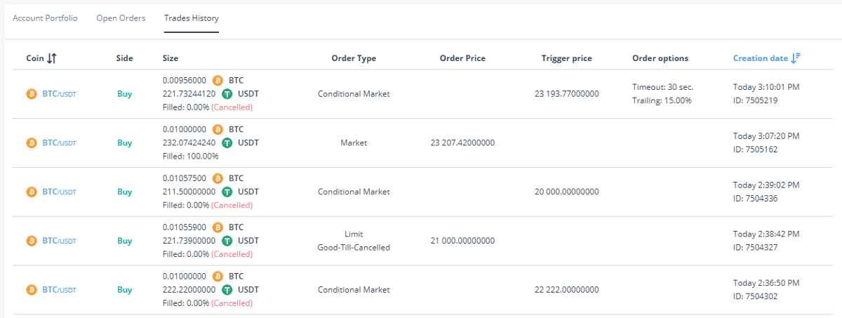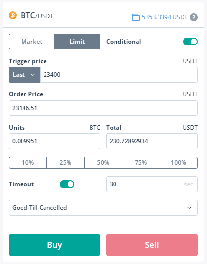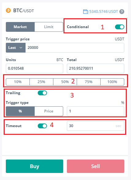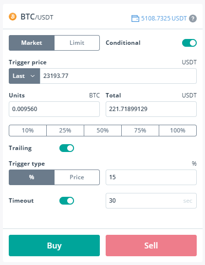 В режиме Pro рыночный ордер уже интереснее. После включения опции Conditional в игру вступает Trailing и Timeout. Первая опция позволяет открыть ордер по более выгодной цене в процентах или самой стоимости, если рыночная цена актива пересечет отметку Trigger price. Например, вы установили Trailing на значении 15% для рыночного ордера на покупку. Цена актива обваливается на 7%, пересекая ваш Trigger price. Ордер готов к размещению и как только цена подойдет ближе чем на 15% к заданной отметке, ордер будет размещен. Опция Timeout в данном случае укажет интервал в секундах, на протяжение которого все вышеописанное не будет исполняться.
