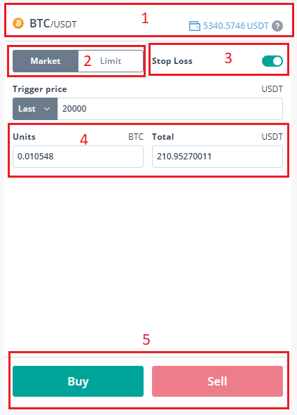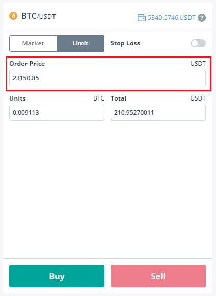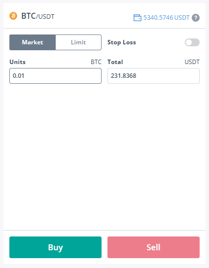 - Поля Units и Total. Размер ордера в криптовалютах из торговой пары (на скриншоте показана пара BTC/USDT, поэтому в поле Units указываются биткоины, а в поле Total — USDT);