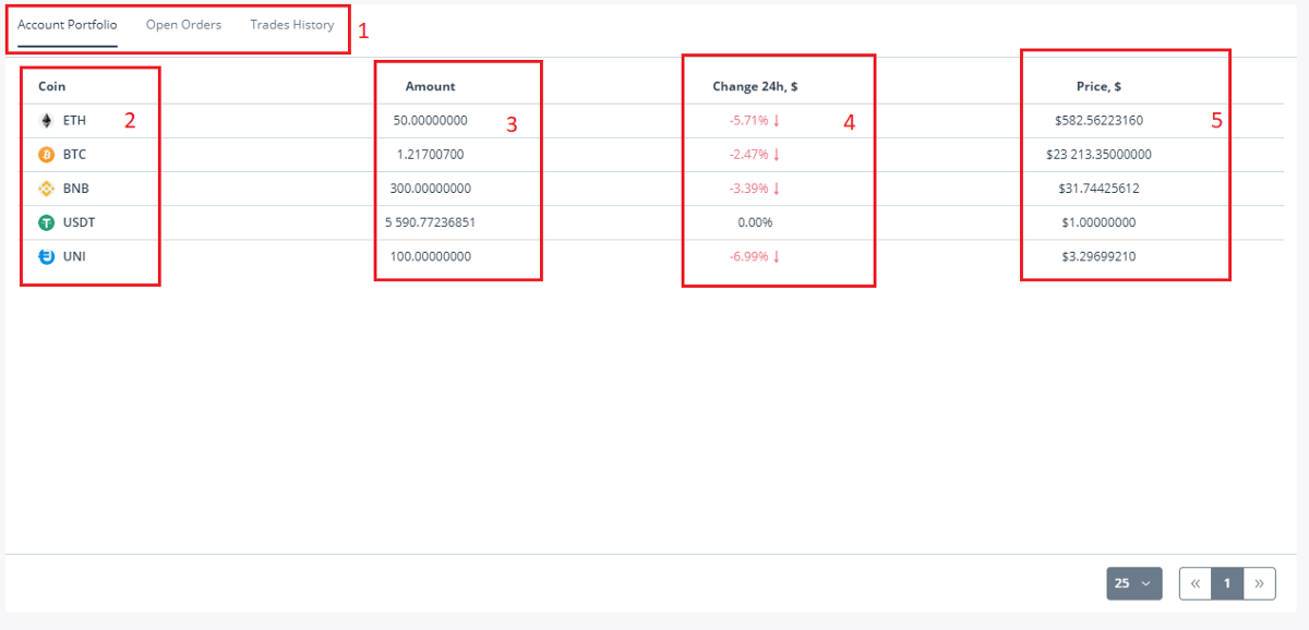 Портфолио аккаунта, открытые ордера и ваши сделки совмещены в одном меню. Между ними можно переключаться (1) вкладками в верхней части. Меню портфолио аккаунта отображает монеты на вашем счету (2), их количество (3), изменение стоимости за последние 24 часа (4) и рыночную цену (5).