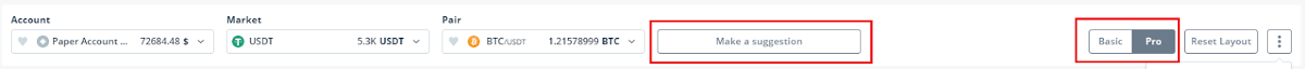 Справа от нее есть кнопка отключения отдельных элементов интерфейса: меню размещения ордеров, ордербука, графика или истории сделок. Здесь же вы можете нажать кнопку Make a suggestion, чтобы предложить свои дополнения к торговому терминалу. Напомним, он все еще находится в стадии бета-тестирования. Переключатель Basic/Pro убирает дополнительные опции из меню размещения ордеров и ордербук.