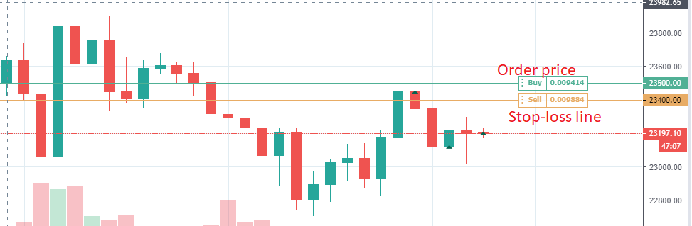 При переключении этой кнопки вас перенаправит к рыночному ордеру. То есть сначала вы выставите лимитный ордер, а Stop Loss реализуется как рыночный ордер с Trigger Price. Как только цена актива пересечет эту линию, стоп-лосс ордер будет исполнен. Вот эти два ордера на графике: