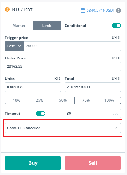 Аналогичное меню, но уже для лимитного ордера. Здесь нет опции Trailing, но под уже знакомой нам кнопкой Timeout можно выбрать тип ордера (пока здесь только одна опция Good-Till-Cancelled). По её условиям ордер будет висеть в биржевом стакане пока его не отменит сам трейдер.