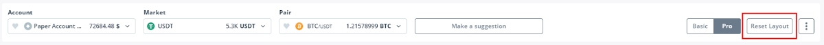 - Меню выбора аккаунта, торговой пары, переключения режимов Basic/Pro терминала и сброса размещения элементов интерфейса;