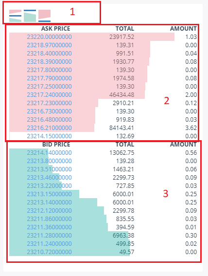 - Управление списками отображаемых ордеров: первая кнопка — показывает как ордера на продажу, так и на покупку, вторая — только ордера на покупку (зеленые), третья — только ордера на продажу (красные);