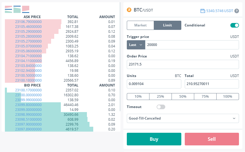 - Переключатель Conditional позволяет задать больше параметров как для рыночного, так и лимитного ордеров. В первом случае можно установить уровень Trigger Price — после его достижения ценой актива рыночный ордер автоматически размещается для исполнения;