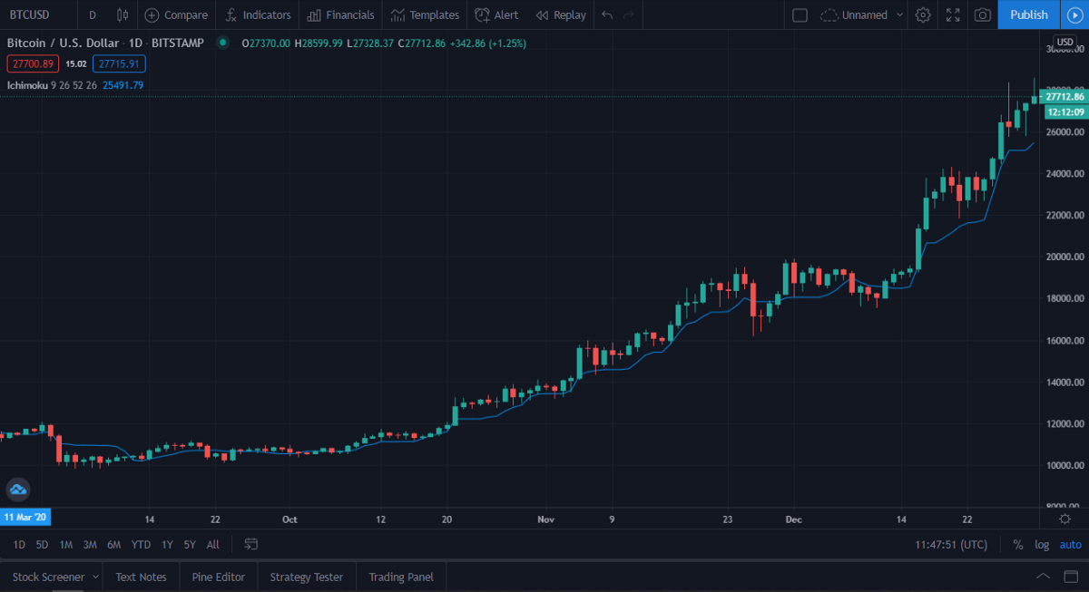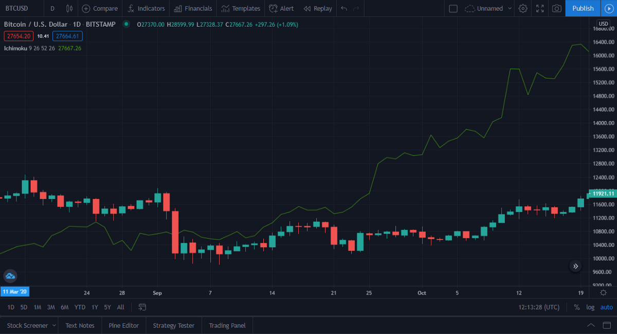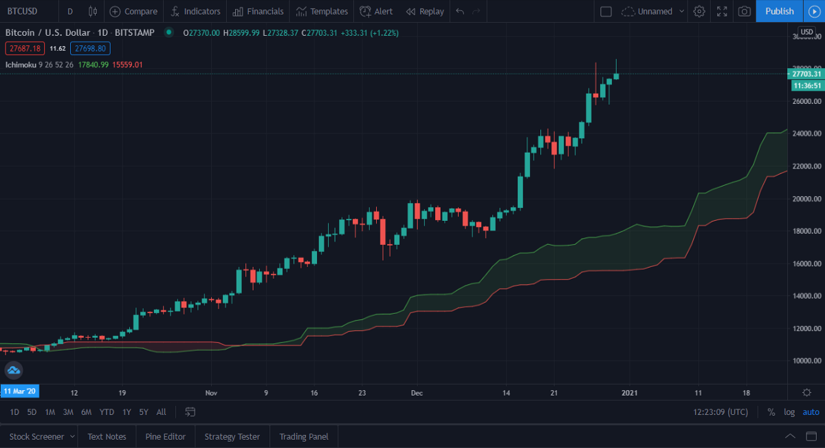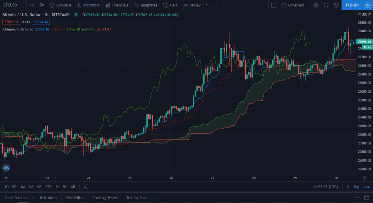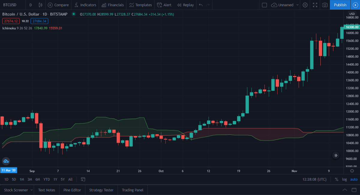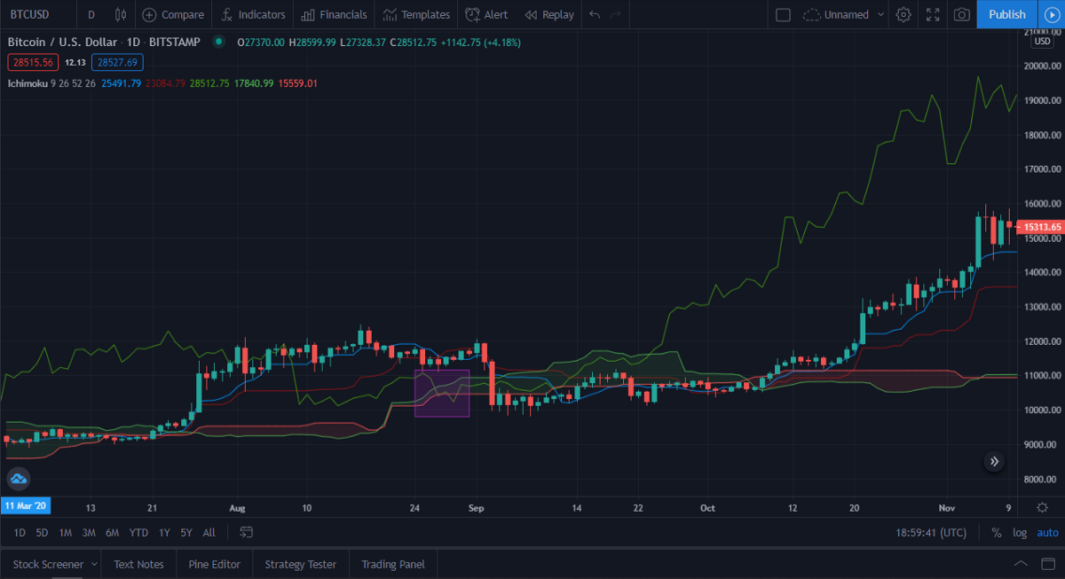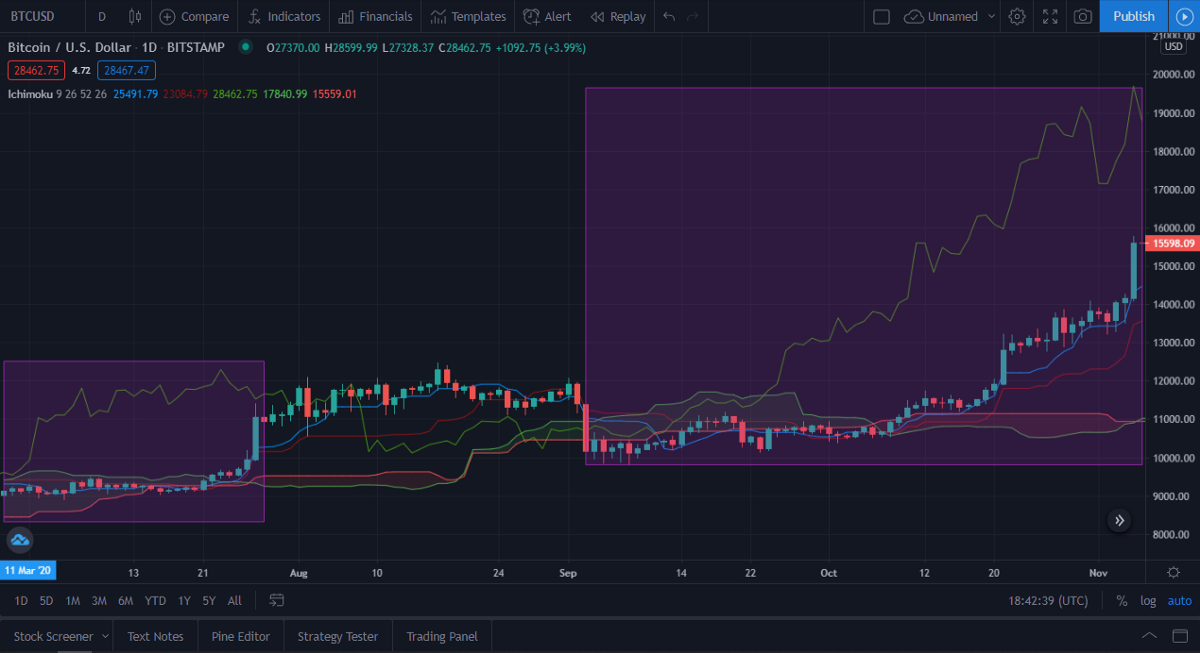 Обратите внимание, что когда свечи находились в облаке, на графике биткоина не было явно выраженного тренда. Но как только цена вышла за пределы Кумо, образовался сильный тренд – так работает Облако Ишимоку.