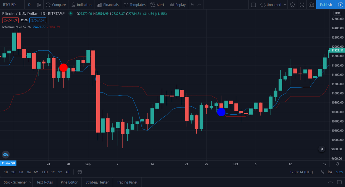 Когда Тенкан-Сен (синяя линия) пересекает Киджун-Сен (красную линия) снизу вверх, трейдеры открывают длинную позицию (Long). Если наоборот, красная линия пересекает синюю снизу вверх, то это может указывать на разворот и падение цены, поэтому возникает сигнал на продажу. Пример отлично иллюстрирует изображение ниже: