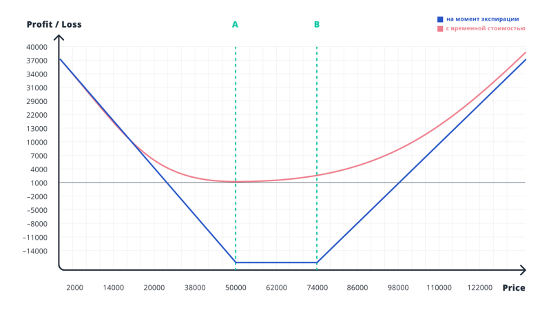 На графике выше по горизонтали отмечена цена базового актива, а по вертикали прибыль/убыток, которые может получить трейдер, пользуясь данной опционной стратегией. Синяя линия показывает зависимость прибыли от цены базового актива в момент экспирации, а красная — в настоящий момент.