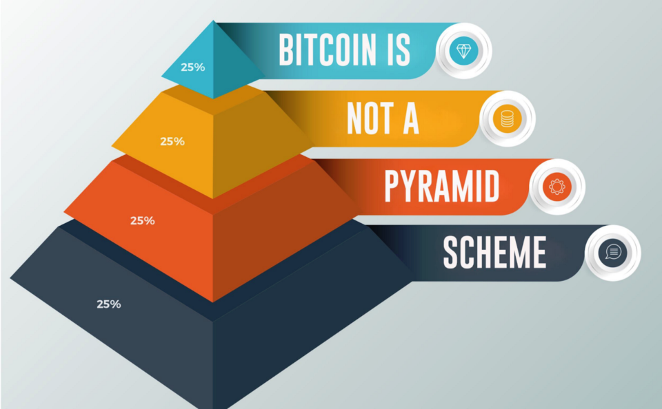 Помимо ложных убеждений о предназначении криптовалют, финансовые пирамиды привлекают к себе часть внимания со стороны потенциальных пользователей. Для повсеместного принятия криптовалют, необходимо привлечение новых участников. Разница между Биткоином и финансовыми пирамидами состоит в том, что в первом случае новые участники необходимы для более широкого принятия массами, в то время как привлечение пользователей в пирамиды обусловлено обогащением участников уровнем выше.