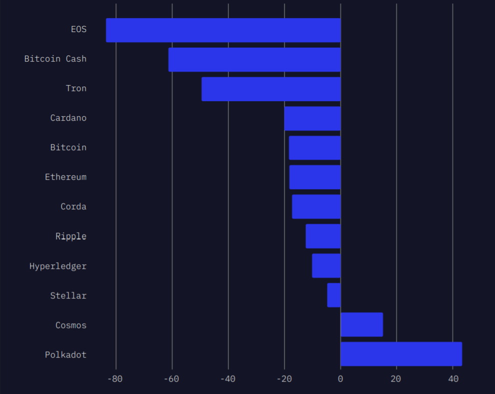 В случае с EOS массовый исход разработчиков, который повлек за собой падение числа обновлений кода на 94%, может быть связан с падением интереса к проекту с момента запуска его основной сети. В случае с TRON, основной причиной исследователи называют негативную рыночную динамику, вследствие которой количество обновлений кода снизилось на 96%.