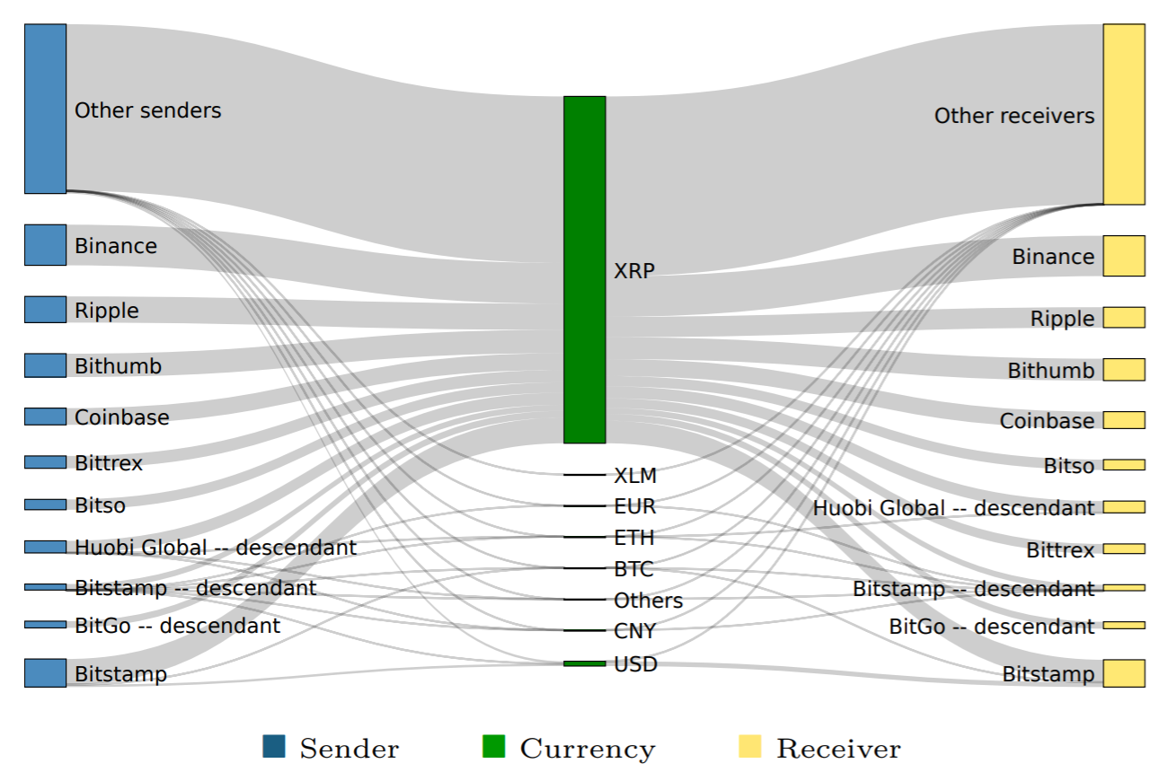 В Ripple более 94% транзакций не имеют экономической ценности: из 90000 кошельков XRP, которые совершили 150 млн транзакций за изученный период, 30000 аккаунтов совершили всего одну транзакцию, в то время как 18 кошельков, связанных с Huobi совершили половину всех транзакций.