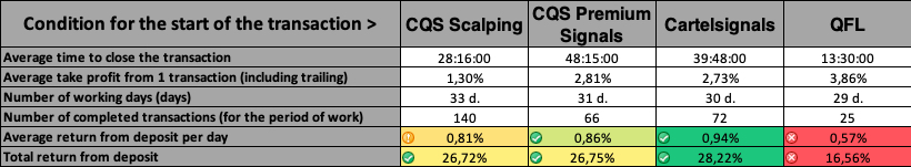 Из моих наблюдений, платные сигналы несколько отличаются от бесплатных реагирую на изменение рынка и уменьшая количество входящих сигналов, что в теории должно сохранить депозит бота. Выводы какой из сигналов меньше затащит вас в «инвест» вы можете сделать по таблице: