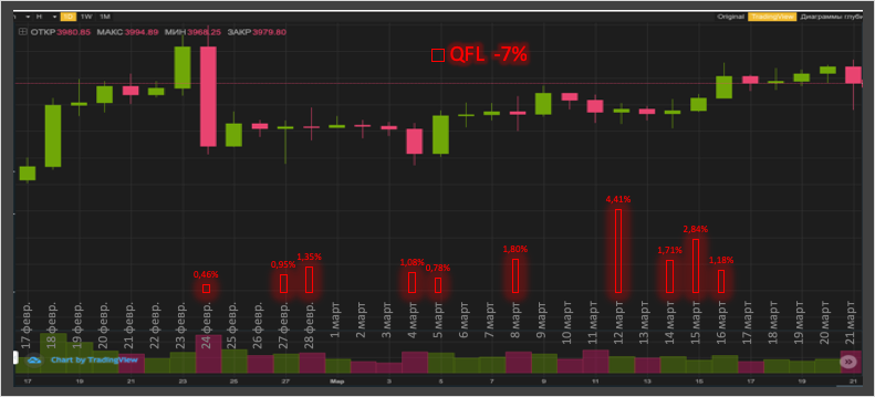QFL (Original) 7 тут возникли небольшие проблемы с рекомендацией от поставщика сигналов т.к я не знал, да и не знаю до сих пор где их взять. По совету @roman506 я поставил профит 3% и примерно 10 дней бот отработал с этим профитом совершив 10 сделок. 13.03 проанализировав сделки бота я понял что цена «отрастает»на 5%..12% от сигнала в течении дня и принял решение увеличить профит от сделки с 3% до 4.7% и с этого числа бот работает с профитом 4.7% и на данный момент совершил 15 сделок. Как настроить подобного бота смотрите тут