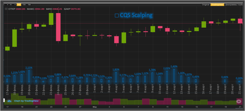 CQS Scalping— рекомендации 1.5%, установленные мной 1.18% . По моим задумкам сделки должны закрываться раньше остальных, сейчас считаю это не обоснованным, но что было то было из «песни» как говорится не выкинешь. Как настроить бота можно посмотреть тут